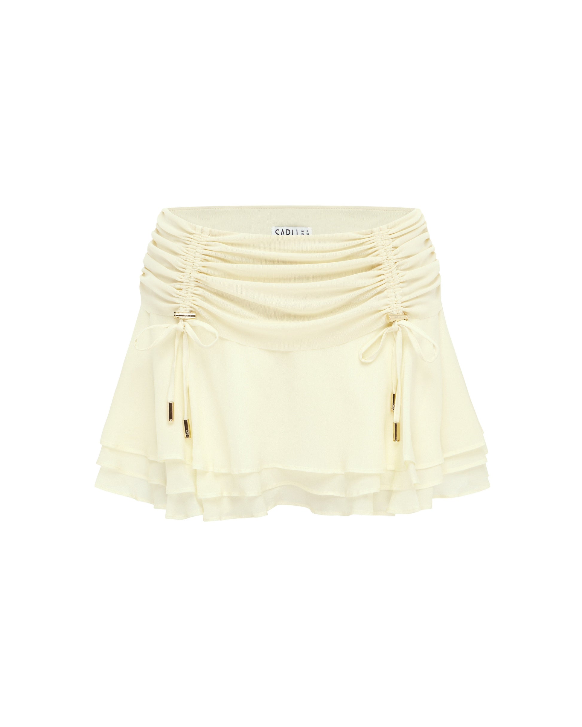 The Gathered Waist Mini Skirt features a thick, multi-layered stretch-net waistband that slips on with ease, with vertical drawstring ties that ruche the waistband and are secured with two signature Sarli cord locks, complimenting the Halter Eyelet Top. The three-layer chiffon skirt is lightweight and flowy, finished with internal satin shorts for comfort and coverage, making it the perfect flirty summer piece.